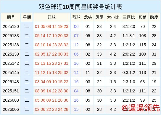 双色球近十周同星期二奖号统计表